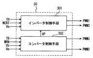 図2は、図1に示す制御装置30の機能のうち、昇圧コンバータ11およびインバータ20の制御に関わる機能を示す機能ブロック図である。図2を参照して、制御装置30は、インバータ制御手段301と、コンバータ制御手段302とを含む。インバータ制御手段301は、トルク指令値TR、モータ電流MCRTおよび電圧Vm(インバータ20への「インバータ入力電圧」に相当する。以下同じ。)に基づいて、後述する方法によって信号PWMIまたは信号PWMCを生成してインバータ20のNPNトランジスタQ3〜Q8へ出力する。