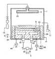 上部電極5は、処理チャンバー1内へのプロセスガスの供給経路にも兼用されている。即ち、上部電極5は、中空状であり、下面にガス吹き出し孔51を多数有する。プロセスガス導入系12の配管は上部電極5に接続されており、プロセスガスは、上部電極5の内部空間に一旦供給された後、ガス吹き出し孔51から吹き出して下方の放電空間に導入されるようになっている。
