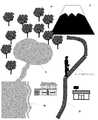 図8はこの発明の一実施例のゲーム内容を説明するためのゲームマップの一例を示す。次に、図8を参照して、この実施例のゲーム内容の概要を説明する。例えば、ゲーム内容が架空のモンスターを捕獲(収集)し育成し、捕獲・育成したモンスターを友達のモンスターと対戦させるゲームの場合は、主人公キャラクタがモンスターを捕獲・収集するために旅に出る設定である。そして、主人公キャラクタが道路を通って池,森,田畑等のモンスター生息場所に入りモンスターに遭遇すると、遭遇したモンスターと先に捕獲し育成しているモンスターとを対戦させ、対戦に勝つと遭遇したモンスターを捕獲でき、プレイヤが持っていない新しいモンスターを追加することができる。これを繰り返すことにより、プログラム的に設定されている一定数(最大数)のモンスターを捕獲して、図鑑を完成させる。この場合、主人公キャラクタが旅に連れて行くことのできモンスターは、一定数(例えば6匹)に定められ、これを手持ちモンスターと呼ぶ。