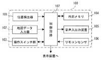 音声入出力装置105は、図示しない入力装置及び出力装置から構成される。入力装置は、ユーザの発話内容を認識して、ナビゲーション装置100の各種入力に用いるものである。一方、出力装置は、スピーカやオーディオアンプ等から構成されるもので、音声案内等に用いられる。