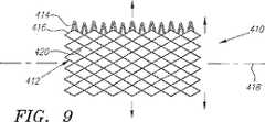 巻きシートステント16,18は、拡張しうる設計、拡張しうる座屈防止セグメント、拡張しうるクラウンをつけた端部のうちの少なくとも1つを有することができる。例えば、図9には、一杯に拡張しうる巻きシートステント410が示されており、この巻きシートステントは、個々の弾性メッシュ要素420を限定し、側縁416縁に沿ってメッシュ要素420に受け入れられるための歯414をもつ実質的に平坦なメッシュ構造412から形成されている。このメッシュ構造412は、長手軸418および円周または外周(図示せず)を長手軸418と実質上直交する平面内で限定すべく、ロール状に巻き込まれる。メッシュ構造412は、ステンレス鋼などの塑性変形しうる材料から作られる。