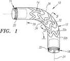 図1,2に示された第1の実施形態では、曲がりくねった要素14は、概ね真直ぐな真直軸方向域32aと、外周壁26の周りに実質上周方向に延びる湾曲した湾曲外周域32bとが一体に形成された複数のジグザグな要素によって限定される。従って、曲がりくねった要素32は、ステント移植片10が長手軸24に対して実質上横方向に向けられたとき、隣接する曲がりくねった要素32相互間での関節運動を容易にするような多数セルの外側骨格14を提供する。