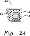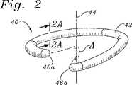 弁形成リング40が、従来技術において規定された多数の方法で構築され得るが、1つの特に有用な構造は、柔軟なコア材料およびファブリックカバーにより囲まれたいくつかの相対的に剛性でありなお弾性の内部構造支持体を備える。例えば、図2Aに見出されるように、弁形成リング40は、縫合透過性コア材料62(例えば、シリコーン)により囲まれ、外部ファブリックカバー64を有する、相対的に剛性でありなお弾性の材料(例えば、Elgiloy)の複数バンドの内部骨格60を備え得る。複数バンド60は、より容易に互いに対して曲がり得るように、プラスチックまたは他の相対的に低摩擦材料(例えば、TEFLON)により分離され得る。複数バンド60(これは、環40の可撓性を制限する)が、軸44に対してほぼ垂直に整列され、従って、この環は、少なくとも軸の周りでの湾曲において可撓性であることが当業者に注目される。望ましくは、本発明の環40は、中心軸44からのラジアル線に沿った軸の周りでの湾曲においてより可撓性である。すなわち、例えば、自由端46a、46bは、互いに対する方向または互いから離れる方向よりも軸に対して平行に上方向および下方向に、容易に曲げられる。図2C〜図2Eに見出されるように、この可撓性の方向付けを達成するための多数の方法が存在する。  Although the