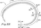 構造支持体150の断面形状は、中間点Mから自由端154a、154bまで、その長さに沿って変化する。前方側部156cの中間点での断面と2つの自由端154a、154bでの断面との間の移行は、ゆるやかであり、そして図9A〜9Cにおいて反映されている。ウェブ162、164は、図9Cにおいて見出されるように、半径方向の寸法において徐々に無くなり、残るのは、矩形の基部166だけである。両方の自由端154a、154bで、半径方向の寸法は、軸方向より短いので、端部は、中心軸152の周りでの湾曲においてより可撓性である。図8A〜8Dにおいて見出される内側環構造支持体の特性は、他の構造(例えば、上記のような、複数の同軸のバンド)と共に与えられ得ることが記述されるべきである。  The cross-sectional shape of the