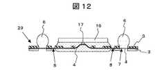 この封止体19の形成において、テープ3及びリード4、即ち、TABテープ29には熱ストレスが作用する。また、樹脂が硬化する際樹脂の硬化収縮が起きるためTABテープ29には応力が発生する。しかし、これら熱ストレスを含む応力も、前述のようにスリット8,開口部18及び反り補強部5が設けられていることから、反りや捩れ等の変形の発生を抑止することができるようになる。TABテープ29の反り及び捩れの防止により、TABテープ29は平坦な状態を維持できるようになり、その後の作業においても支障を来さなくなる。なお、図11を含み以降の断面図では、デバイス孔15に両側から延在するリード4の先端が同一のバンプ電極17に接続した状態として示すが、実際には左右どちらかのリード4が接続するものである。  In the formation of the sealing