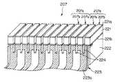 一方、図24に示すように複数の超音波トランスデューサ素子207a,…,207aを配列した超音波トランスデューサ207は、ジルコン酸チタン酸鉛Pb(Zr,Ti)O3 等のPZT系圧電セラミックス等で形成された圧電素子221とこの圧電素子221の背面側に配設されるバッキング材222とで構成されている。前記圧電素子221の両面には電極221a,221bが設けられている。そして、前記電極221bにはフレキシブルプリント基板223のパターン223aが図示しない半田で電気的に接続されている。