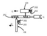図5は光源ユニット109と被走査面106を対応して移動させるための機構について示す図である。図4に示すような配置で光源ユニット109と被走査面106を配置すると、被走査面106の移動による視度調節の際には、それぞれの部品は同じ方向に移動する。このために、図5に示すように調整シャフト201に溝を作製しておき、それぞれの部位に光源ユニット109と被走査面106を連動して移動するように構成しておく。調整シャフト201をGの方向に回すことによって光源ユニット109と被走査面106をG方向に同時に移動させることが可能となる。また調整シャフト201を逆向きに回すことによって両部材は前述した方向とは逆方向に移動する。調整シャフト201の回転方向とそれぞれの部材の移動方向は逆でも構わない。  FIG. 5 is a diagram showing a mechanism for moving the