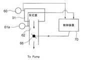 排気管62〜65の排気圧力は、各排気管に取り付けられている真空計61a〜61dの値が同一になるように、各圧力制御用回転式バルブ66〜69の開閉度を調節することで制御される。このとき、圧力制御用回転式バルブ66〜69の開閉度は、0〜90度の範囲で最適な値に設定される。例えば0度に設定されると、排気管は完全に閉塞した状態であり、90度に設定されると、排気管は完全に開放した状態になる。図2は、図1のALD装置の一部を模式的に示す系統図である。図2に示すように、反応室31内の真空度は真空計60でモニターされ、その計測値が制御装置70に送られる。更に排気管62の排気圧力をモニターする真空計61aの計測値も、同様に制御装置70に送られる。制御装置70は、真空計60の計測値が予め定められた設定圧力になるように制御すると共に、真空計61aの計測値が他の排気管をモニターする真空計61b〜61dの計測値と同じになるように、圧力制御用回転式バルブ66の開閉度を調節する。図2では、排気管62のみを図示しているが、他の排気管63〜65も、排気管62と同様に制御装置70を用いて制御している。  The exhaust pressure of the