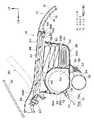 また、モジュールケース26の内部後方側には、所定の折り畳み方(蛇腹折り、ロール折り等)で折り畳まれたエアバッグ40が配設されている。なお、エアバッグ40の端末部は、狭幅なリテーナ50を介してリベット等の固定具52でモジュールケース26の上端部に固定されている。また、インフレータ38とエアバッグ40との間には、インフレータ38から噴出されたガスを整流するための複数の開口部(図示省略)が形成されたディフューザ54が配設されている。  Further, an