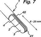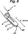 残りの図は、組織7の凝固あるいは乾燥を行なうための、第三電極40を備えた装置を示めしている。図6aにおいて、メス1は図4bの構造にもとずいて示めされていて、類似の部品は同一符号が付番されている。第三電極40は、第一電極2と対向して第二電極3に取りつけられていて、さらに電気絶縁体41に取りつけられている。RF信号はジェネレータ10からリード線42を介して第三電極40へ供給することができる。絶縁体41は、シリコンラバーの薄い層か、又はポリマイド、PEEK若しくはPVC材料を含む別の材料の薄い層で作られている。薄い層により、熱がシリコンラバー層を通過することを保証され、かつ凝固用電極40が第二電極3の熱伝導の恩恵を受けることができることを保証されている。このようにして、第一電極2により発生された熱にもかかわらず、凝固用電極40は比較的低温に維持されている。使用にあたって、組織は前述したように切開される。切開の代りに凝固が所望される場合、第三電極40は組織7と接触して置かれ、凝固用RF信号が第二電極3と第三電極40との間に作用される。  The remaining figures show a device with a