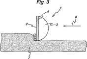 リード線5が第一電極2と接続されていて、リード線6が第二電極3と接続されている。ジェネレータ10からのRF出力はリード線5及び6を介してメス1と接続されていて、従ってほぼ一定のピーク電圧(一般に約400V)を有する無線周波数が第一電極2と第二電極3との間に出現するようになっている。図3において、メス1が組織7の対象部位に接触されると、RF電圧は一方の電極と組織表面との間でアークを発生する。第一電極2は、第二電極3と比較して断面積が小さく、かつ熱容量及び熱伝導率が小さいので、第一電極が活性電極の役割を果し、アークはこの第一電極から組織7へ発生する。電流は、組織7から第二電極3へ流れ、この第二電極が帰還電極の役割を果している。組織の切開が活性電極において生じる場合、メスが組織を通って移動する。メス1は組織7における切開に使用されてもよいし、あるいは組織層を除去するために、図3において矢印8の方向に横断的に移動されてもよい。  The lead wire 5 is connected to the
