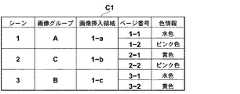 図14は、イベントのシーン、画像グループ、画像挿入領域、テンプレートのページ番号および色情報を対応づけた対応づけテーブルを示す図である。なお、第2の実施形態においては、3ページを有し、各ページに画像挿入領域1−a,1−b,1−cをそれぞれ有するテンプレートT3を使用するものとする。図14に示すように対応付けテーブルC1には、シーン1、画像グループAおよび画像挿入領域1−aが対応づけられ、シーン2、画像グループCおよび画像挿入領域1−bが対応づけられ、シーン3、画像グループBおよび画像挿入領域1−cが対応づけられている。さらに、シーン1、画像グループAおよび画像挿入領域1−aとテンプレートのページ1−1および1−2とが対応づけられ、シーン2、画像グループCおよび画像挿入領域1−bとテンプレートのページ2−1および2−2とが対応づけられ、シーン3、画像グループBおよび画像挿入領域1−cとテンプレートのページ3−1および3−2とが対応づけられている。さらに、ページ1−1および1−2にはそれぞれ水色およびピンク色が、ページ2−1および2−2にはそれぞれ黄色およびピンク色が、ページ3−1および3−2にはそれぞれ水色および黄色の色情報が対応づけられている。  FIG. 14 is a diagram showing an association table in which event scenes, image groups, image insertion areas, template page numbers, and color information are associated with each other. In the second embodiment, a template T3 having three pages and having image insertion areas 1-a, 1-b, and 1-c on each page is used. As shown in FIG. 14, in the association table C1,
