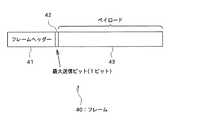 図3は、最大電力送信中情報の例である。同図は、移動局装置10から基地局装置20に送信される通信信号の例である。同図に示すように、通信信号は、通信制御のための制御情報を含むフレームヘッダー41と、1ビットのデータからなる最大送信ビット42と、通信内容であるペイロード43と、から構成される。最大電力送信中情報送信部13は、このうち最大送信ビット42により最大電力送信中情報を送信する。すなわち、最大電力送信中情報送信部13は、最大送信ビット42に1を設定することにより最大電力送信中情報を送信する。  FIG. 3 is an example of maximum power transmission information. The figure is an example of a communication signal transmitted from the