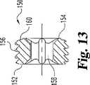 ここで図11−13を参照すると、アンカー30、130へ適用する本発明に係る別の実施の形態の結合部材150を示す。結合部材150は、アンカー30、130と結合部材150との間に位置したときに細長部材80に当接する末端支持表面160を有する。結合部材150はまた工具受け入れ部158のまわりを伸びる突起154の形をした細長部材係合部分をその末端に有する。工具受け入れ部158はプラグ本体152を貫通する貫通穴を提供する。駆動工具は結合部材150をアンカー30、130の内ネジヘッドに係合させるために結合部材150に回転駆動力を適用するように工具受け入れ部158内で位置決めできる。  Referring now to FIGS. 11-13, another embodiment of a