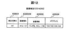 図12は、装置検出リスト4350の構成を説明するための図である。図示するように、検出対象装置の識別子である検出対象IDを登録するためのフィールド43501と、検出対象装置の種別を登録するためのフィールド43502と、検出対象装置の製造元、製品名といった装置情報を登録するためのフィールド43503と、検出対象装置のIPアドレスを登録するためのフィールド43504と、を備えてレコードが形成されている。図12の例では、旧ストレージ装置5000の属性情報が登録されている。新ストレージ装置4000は、移行マネージャPG4345により、装置検出リスト4345に従い管理用ネットワーク6000経由で旧ストレージ装置5000にアクセスし、旧ストレージ装置5000の構成情報を入手する。なお、装置検出リスト4350のレコードは、計算機システムのシステム管理者等が管理端末1000を用いて登録する。あるいは、ファイバチャネルプロトコルが提供するネームサービスなどを用いて自動的に登録する。  FIG. 12 is a diagram for explaining the configuration of the