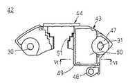 レギュレータアッセンブリ40は、図7の(a)に示されるように、スリンガ部21の軸心をリヤブラケット2の軸心に合わせて、整流器12の略C字状の両端部間に配置され、取付ねじ55,56によりリヤブラケット2の内壁面に締着固定される。これにより、整流板部43の表面が整流器12の冷却ファン7bのブレードに対向する面と同一面位置となり、平坦な環状のブレード対向面を構成する。  As shown in FIG. 7A, the