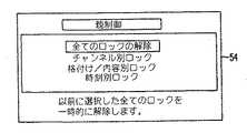 ロックされた番組にアクセスするためには、ユーザーは、親制御メニュー54から「全てのロックの解除」機能を選択することができ、ロックされた番組は全てロック解除されることになる。代替的には、ユーザーは、ガイド内にある間に約1秒間SELECTキーを入力することによって、テレビ予約情報ガイドから全てのロックを解除することができる。ポップアップが現われることになり、ユーザーは「全てロック解除」オプションを選択することができる。  In order to access locked programs, the user can select the “Unlock All” function from the