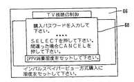 図2Fは、購入パスワードが設定されず、ユーザーが視聴制御メニュー66からの「IPPV消費限度のセット」機能を選択した場合にユーザーに対し示されるポップアップ64の好ましい一実施形態を示す。IPPVはインパルスペイ・パー・ビューの略であり、例えばリモコンといったユーザー入力装置を介して購入されるPPV番組を意味する。これは、番組を購入するのにユーザーが番組プロバイダを電話で呼出す必要のある従来のPPV番組とは異なっている。ユーザーは、ユーザー入力装置上でキーを押すか又はそれをTV予約ガイド上で選択するかのいずれかによってSELECTキーを入力することにより、メインメニュー50から購入パスワードを設定することができる。図2Gは、購入パスワードが設定されユーザーが視聴制御メニュー66から「IPPV消費限度のセット」機能を選択した場合にユーザーに示されるポップアップ68の好ましい一実施形態を示す。この場合、ユーザーは、単純に購入パスワードを入力し、SELECTキーを入力することになる。図2Gに示されているように、ユーザーが間違った場合、ユーザーはCANCELキーを入力し、パスワードを再入力することができる。  FIG. 2F shows a preferred embodiment of a pop-