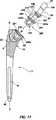 次に、図7及び図8を参照すると、修正外科手術の間、特に、幹状構成要素11が末端方向にセメント接着されているとき、貴重な骨を除去し又は傷付けずに、幹状構成要素11を大腿骨から除去することは困難であることが理解されよう。図7及び図8には、幹状構成要素11の基端部分14を腔又は管内に固定する骨セメント又はその他の生体適合性材料を使用して骨の腔又は管内に植え込むことのできるハイブリッドな幹状構成要素11が示されている一方、幹状構成要素11の末端部分16は、骨の管内に圧力嵌めすることができる。  Referring now to FIGS. 7 and 8, the stem configuration is removed during revision surgery, particularly when the