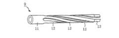 本実施形態の特徴は、図4に示した管腔内挿入具8の基本構成のうち、上記杆状部12を円筒部11の軸線方向に沿った直線的な部材でなく、円筒部11の軸線方向と交差する螺旋(ヘリカル)的な部材とした点にある。このような螺旋状の杆状部12は例えば前述したワイヤー放電加工又はレーザービーム加工等の微細加工方法を実施する場合に、上述した円筒体の周方向に回転を与えながら溝を形成することにより容易に得られる。このような構成によれば、ガイドワイヤを上記溝に沿う回転を与えながら生体管腔内に挿入することによりその挿入が容易となる、いわゆる螺子効果を得ることができる。