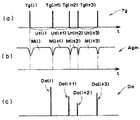 一方、ラインセンサ部組33によって検出され出力された反射励起光Lhの強度を表すアナログ反射光信号Ahはプリアンプ51によって増幅された後、微分回路52によって微分され整流されて反射励起光Lhの強度が急激に変化した箇所を表す信号が識別され、すなわち蛍光体層1のセル隔壁を表す信号が識別され、アナログ微分反射光信号Abとして出力される。微分回路52から出力されたアナログ微分反射光信号Abはトリガー信号発生器53に入力され、このトリガー信号発生器53によって上記アナログ補正画像信号AgmをA/D変換するときのサンプリングのタイミングを表すトリガー信号Trが生成されA/D変換器44に出力される。また、このトリガー信号Trはサンプリング時間算出器54にも出力され、このサンプリング時間算出器54によって上記サンプリングのタイミングを表す各トリガー信号間の時間間隔(サンプリング時間)が順次が求められ、その値はサンプリング時間データDsとしてサンプリング時間メモリ55に記憶される。なお、このサンプリング時間データDsはセルの間隔(セルのピッチ)を、セルを走査する励起光の時間間隔として求めたものであり、このサンプリング時間データDsを励起光の主走査速さによって除算すれば、セルの間隔(セルのピッチ)を長さとして表すこともできる。