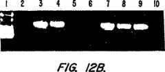 図12A及び12Bは、DOPE:DODAC(50:50)から構成される、予備形成されたリポソームに複合体化されたプラスミド(A)及びDOPE:DODAC:PEG−Cer−C14粒子内に封入されたプラスミド(B)のDNアーゼIによる消化に対する耐性を示す。プラスミドDNAが抽出され、そしてゲル上での可視化のために増幅するためにPCR(ポリメラーゼ鎖反応)にゆだねられた。遊離プラスミドが対照として使用された。レーン1:1kbのDNAマーカー;レーン2:PCR陰性対照(DNAを含まない);レーン3:遊離プラスミドのみ;レーン4:0.05%界面活性剤(Triton X-100)中での遊離プラスミド;レーン5:界面活性剤の不在下でDNアーゼIと共にインキュベートされた遊離プラスミド;レーン6:界面活性剤の存在下でDNアーゼIと共にインキュベートされた遊離プラスミド;レーン7:複合体化された(A)又は封入された(B)プラスミドのみ;レーン8:0.05%界面活性剤中での、複合体化された(A)又は封入された(B)プラスミド;レーン9:界面活性剤の不在下でDNアーゼIと共にインキュベートされた、複合体化された(A)又は封入された(B)プラスミド;レーン10:界面活性剤の存在下でDNアーゼIと共にインキュベートされた、複合体化された(A)又は封入された(B)プラスミド。