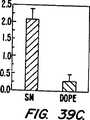 図39A, 39B及び39Cは、100mMのOGPを用いて調製され、続いて透析された、pCMVβ/SM/DODACから構成される核酸−脂質粒子配合物(1:1のSM/DODACモル比及び1:1〜8:1の電荷比)を用いてインビボチャイニーズハムスター卵巣(CHO)細胞リポフェクションを示す。(A)βガラクトシダーゼリポフェクションに対する電荷比の影響。(B)4:1の電荷比を用いて調製された配合物についてのウェル当たりの減じられたβ−ガラクトシダーゼ、活性により測定されるような粒子誘発された毒性。(C)中性脂質としてSM(実線の棒)又はDOPE(斜線の棒)を用いて調製された核酸−脂質粒子(4:1の電荷比、及び1:1のDODAC/中性脂肪のモル比)により達成されるβ−ガラクトシダーゼリポフェクション。