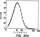 図37A, 37B及び37Cは、pCMVβ/DODAC/SM(2:1の電荷比、1:1のDODAC/SMのモル比)から構成され、そして透析の前(●)及び後(■)で20mMのOGPを用いて調製された核酸−脂質粒子配合物について、固体粒子分析態様で作動するQELSにより決定される容積−重量粒子サイズ分布を示す。透析後の同じ核酸−脂質粒子配合物がまた、電子顕微鏡により試験された(B、負の染色及びC、凍結−破壊)。縮尺棒=100nm。