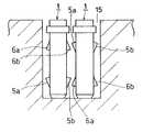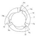 そして、図5に示す如く、前記インプラント本体2の上部の2箇所のスリット部3に囲まれる領域を各々インプラント本体2の外周面から外方に膨出させて、2個の膨出部4a,4bとし、インプラント本体2の中央部の2箇所のスリット部3に囲まれる領域を各々インプラント本体2の外周面から外方に膨出させて、インプラント本体2の上方に向けて開口した2個の膨出部5a,5bとし、さらに、インプラント本体2の下部の2箇所のスリット部3に囲まれる領域を各々インプラント本体2の外周面から外方に膨出させて、インプラント本体2の下方に向けて開口した2個の膨出部6a,6bとしている。