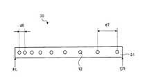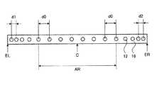 各発光部12は、複数の発光部12を並列させた部分の中心部Cから左端部ELへ向かうに従って、また中心部Cから右端部ERへ向かうに従って、発光部12同士の間隔が漸次小さくなるように配置されている。左端部ELに最も近い発光部12同士の間隔d1は、中心部Cに最も近い発光部12同士の間隔d0より小さい(d1<d0)。右端部ERに最も近い発光部12同士の間隔d2は、中心部Cに最も近い発光部12同士の間隔d0より小さい(d2<d0)。このように、発光部12は、両端部EL、ER付近における間隔d1、d2を、中心部C付近における間隔d0より小さくさせて配置されている。  As for each