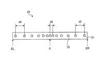 各発光部12は、複数の発光部12を並列させた部分の左端部ELから中心部Cへ向かうに従って、また右端部ERから中心部Cへ向かうに従って、発光部12同士の間隔が漸次小さくなるように配置されている。中心部Cに最も近い発光部12同士の間隔d3は、左端部ELに最も近い発光部12同士の間隔d4より小さい(d3<d4)。中心部Cに最も近い発光部12同士の間隔d3は、右端部ERに最も近い発光部12同士の間隔d5より小さい(d3<d5)。このように、発光部12は、中心部C付近における間隔d3を、両端部EL、ER付近における間隔d4、d5より小さくさせて配置されている。  As for each