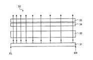 図14は、上記の半導体レーザ31に波長変換素子33及び外部共振器35を組み合わせた光源装置32の概略構成を示す。外部共振器35は、半導体レーザ31に設けられた各発光部12(図11参照)からのレーザ光を共振させる。波長変換素子33は、複数の発光部12及び外部共振器35の間の光路中に設けられている。波長変換素子33は、各発光部12からのレーザ光の波長を変換させる。波長変換素子33としては、例えばSHG素子を用いることができる。波長選択素子34は、波長変換素子33及び外部共振器35の間に設けられている。波長選択素子34は、所定の波長のレーザ光を選択的に透過させる。なお、外部共振器35は、図11に示す光源装置30に適用することとしても良い。  FIG. 14 shows a schematic configuration of a