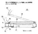 図1は従来の大容量電池パック10を示す。大容量電池パック10は、携帯型のパソコン20の本体部21の手前側の凹状部22に嵌合して、図2に示すように、装着される。大容量電池パック10の上面11は平面である。大容量電池パック10のうち、符号12で示す部分が、装着された状態で、本体部21の前側壁23から手前側に張り出す。25は本体部21に対して開閉可能である液晶表示部である。パソコン20を使用する場合には、操作者は、指先部30で液晶表示部25の先端部26を引っ掛けて引き上げて、液晶表示部25を開く操作を行う。