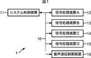 図1は、本発明を適用した情報処理システムの構成例を表している。同図に示されるように、情報処理システム1は、システム制御装置11と、信号処理装置12乃至15が、バス10により相互に接続されている。また、必要に応じて、このバス10には、音声遅延制御装置16も接続される。  FIG. 1 shows a configuration example of an information processing system to which the present invention is applied. As shown in FIG. 1, in the