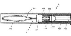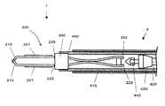 図11は、本発明によるクリップ装置の一実施形態を示す全体の概略図である。クリップ装置は、長尺の筒状体420と、筒状体420内に進退自在に挿通され、先端部に、クリップ1と係合する第一の係合手段440を有するワイヤ430と、筒状体420の基端側に設けられ、ワイヤ430と連結し、クリップ1の開閉を操作する操作部460とを備える。  FIG. 11 is an overall schematic view showing an embodiment of a clip device according to the present invention. The clip device includes a long