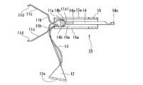 牽引分離部材14は棒状の部材であり、その先端には、把持部材11の挿入孔11a1を貫通する一対の挿入片14aと、挿入片14aの先端に設けられた、基部11aの内面に係合して、挿入片14aが基部11aから抜け出すのを防止する抜け止め部14bとが設けられている。さらに、牽引分離部材14の基端部には鈎部14cが形成されている。牽引分離部材14は、プラスチックやSUS等の金属材料から成形されており、所定の切断力以上の強い力を受けると切断される程度の強度である。