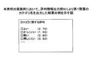 図8の評判情報に対し、第1階層において同じ評価表現を持つ評判情報が同じカテゴリに属するように評判情報を複数のカテゴリに分類した結果を図9に示し、各カテゴリに対し評価表現をカテゴリ名として付与した結果を図10に示す。さらに、図9で示した第1階層で分類されたカテゴリごとの評判情報に対し、第2階層において同じ属性表現を持つ評判情報が同じカテゴリに属するように複数のカテゴリに分類した結果を図11に示し、各カテゴリに対し属性表現をカテゴリ名として付与した結果を図12に示す。 FIG. 9 shows the result of classifying reputation information into a plurality of categories so that the reputation information having the same evaluation expression in the first hierarchy belongs to the same category with respect to the reputation information of FIG. The results given as names are shown in FIG. Further, with respect to the reputation information for each category classified in the first hierarchy shown in FIG. 9, the result of classification into a plurality of categories so that the reputation information having the same attribute expression in the second hierarchy belongs to the same category is shown in FIG. FIG. 12 shows the result of assigning an attribute expression as a category name to each category.