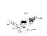 同図において、ユーザ301は、携帯端末100の音出力部105(図1)により、上記のように生成された再生音を聞くことができる。例えば、音楽再生中に着信音があった場合には、再生中の音楽302がユーザ301の左後方から、また、着信音303がユーザの右手前方から夫々聞こえるように、異なる音が異なる方向から聞こえる。  In the figure, a