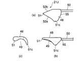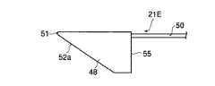 血管保持子21の先端部は、組織を剥離するための鋭角な剥離部51として形成されている。また、血管保持子21には、剥離部51から連なるように左右対称的に第1のテーパ面52a,52bが形成されている。すなわち、本体の先端部は、鋭角を成して先細るテーパ形状に形成されている。さらに、剥離部51の上下面には先端に向かって上下面が狭幅となるように斜面53a,53bが形成されている。血管保持子21の操作ロッド50との結合部と反対側の第1のテーパ面52aの裾部は円弧状の第2のテーパ面54に形成され、この第2のテーパ面54は血管保持子21の平坦面からなる後端の血管を引っ掛ける引っ掛け部55に連続している。すなわち、本体は、生体組織を引掛けるための後端部を更に有している。