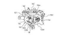 また、旋回板163の後方腕部163bの先端には、円形穴125cの略径方向に沿うスライド面163eが形成されており、このスライド面163eには、旋回板162の前方腕部162aの前端部が接触しないように設定されている。また、旋回板162の後方腕部162bの先端には、円形穴125cの略径方向に沿うスライド面162eが形成されており、このスライド面162eには、旋回板161の前方腕部161aの前端部が摺接可能とされている。ここで、旋回板161の長穴161d及び旋回板162,163のスライド面162e,163eは、各旋回板161〜163が同一方向に旋回するように設定された凹状の湾曲形状に形成されている。A