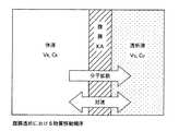 図17は、Pyle-Popovichモデルを簡潔に示した腹膜断面図である。当図中の矢印の向きが示すように、均質膜と仮定した腹膜を介して、体液側から透析液側への溶質移動は、透析液への溶質分子拡散と、対流(水分移動による物質移動すなわち対流輸送と、腹膜下のリンパ吸収による逆流)の和で示される。この数理モデルは次の数式1の(1-1)〜(1-8)で表すことができる。