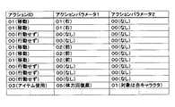 図4はアクションデータの例を示す図であり、1行(横一列のデータ群)がアクションデータ要素を構成している。この図4はアクションのあったフレームのデータのみを記録する場合の例を示しており、フレームを識別するためのフレームナンバー、アクションの種別を示すアクションID、アクションの内容を示すアクションパラメータ1、アクションパラメータ2等を含んでいる。なお、フレームを識別するためにはフレーム単位の時間情報がわかればよいため、フレームナンバーに代え、秒の小数点以下までを含めた時間情報(例:01時23分45.67秒)としてもよい。また、アクションパラメータの数は任意に設計が可能であり、パラメータそのものが無くてもよい(図ではパラメータが無い場合は「00(なし)」と表示)。更に、アクションID等を数値データで表しているが、「移動」といった文字列データとしてもよい。  FIG. 4 is a diagram showing an example of action data, and one row (one horizontal data group) constitutes an action data element. FIG. 4 shows an example in which only data of a frame with an action is recorded, a frame number for identifying the frame, an action ID indicating the type of action, an