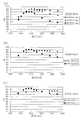 青色LEDチップ11と、赤色LEDチップ12と、蛍光体13との組み合わせについて、本願発明者が最適化に際して検討したパターンの代表例を図11から図13に示す。図中の縦軸には、LEDランプ100のRaをとり、横軸には、赤色LEDチップ12の発光ピーク波長(nm)をとっている。LEDランプ100のRaは、実測またはシミュレーション結果に基づいている。図中の各ポイント(丸印、三角印、四角印)においては、各々、図8(a)〜(c)および表1のような検討が行われている。  Representative examples of patterns studied by the inventors of the present application for the combination of the