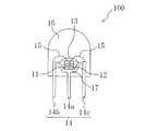 リードフレーム14は、不図示の外部回路(例えば点灯回路)に電気的に接続されており、リードフレーム14に電力を供給して、青色LEDチップ11および赤色LEDチップ12を動作させると、赤色成分が補われた白色光がランプ100から発光することになる。また、リードフレーム14に供給する電力を調節することによって、ランプ100の明るさを制御することができる。  The