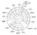中間周に配置された前記フィルタ群42は、外周寄りに配置された透過帯域幅が狭い複数のフィルタ42aa、42ab、42acで構成されるフィルタ群42aと、内周寄りに配置された透過帯域幅が広い複数のフィルタ42ba、42bb、42bcで構成されるフィルタ群42bで構成されており、これらフィルタ群42aの内周とフィルタ群42bの外周とは、接して配置されている。また、フィルタ42aaとフィルタ42ba、フィルタ42abとフィルタ42bb、フィルタ42acとフィルタ42bcは、回転軸からみてそれぞれ同一方向に配置されている。  The