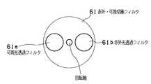 図10に示すように、前記赤外・可視切替フィルタ61は、可視光を透過する可視光透過フィルタ61aと、赤外光を透過する赤外光透過フィルタ61bを有して構成されており、これら可視光透過フィルタ61a及び赤外光透過フィルタ61bのそれぞれの分光透過特性は、図11に示す特性になっている。この赤外・可視切替フィルタ61が回転軸の周りに回動することによって、可視光透過フィルタ61aと赤外光透過フィルタ61bとが、選択的に照明光上に挿入されるようになっている。 As shown in FIG. 10, the infrared / visible switching filter 61 includes a visible light transmission filter 61a that transmits visible light and an infrared light transmission filter 61b that transmits infrared light. The spectral transmission characteristics of the visible light transmission filter 61a and the infrared light transmission filter 61b are the characteristics shown in FIG. By rotating the infrared / visible switching filter 61 around the rotation axis, the visible light transmitting filter 61a and the infrared light transmitting filter 61b are selectively inserted into the illumination light. .