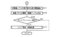 測定値が推奨値の95%より小さい場合(S40でYES)、CPU2は、推奨ブライトネス時の輝度の相対比LGC255/LPC255、及び低ブライトネス時の輝度の相対比LGL/LPLを線形補間して、キャリブレーション時のブライトネスにおける輝度の相対比LG/LPを算出し(S44)、推奨ブライトネス時の輝度の相対比LGC255/LPC255とキャリブレーション時のブライトネスにおける輝度の相対比LG/LPとの差分に応じた補正係数α2に基づいて、階調補正テーブル5eを更新し(S43)、ステップS41以降の処理を続ける。When the measured value is smaller than 95% of the recommended value (YES in S40), the
