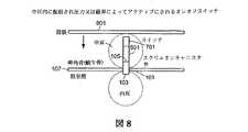 図7は、発明の実施の形態に従って皮下に移植することができるスイッチを示す。様々な実施の形態(ピストン付きのリザーバ、リザーバ及びポンプ、キャニスタ上のねじ、詰替可能及び詰替不可のリザーバ、移植蝸牛刺激装置システムが組み込まれたリザーバ、岬角に弁が設けられ又は設けられていないドラッグデリバリ[薬剤配送]システム等)において、薬剤配送の間に患者が副作用で苦しむ場合、いかなる時にも流体の配送を止める手段を設けることができる。例えば、遠隔計測受信機付きのポンプが設計に含まれているときならばその遠隔計測を介して流体の流れを止めることとしてもよい。受動型の機械的オンオフスイッチ701によってもまた流体を止めることとしてもよい。そのようなオンオフスイッチ701は、例えば、カテーテルの上、リザーバの上、又は弁の上に組み込まれてもよい。スイッチ701は(それが例えば、皮膚直下の頭蓋骨の表面に位置し、また)それが外部からアクセス可能であるならば、それを手動でオン・オフ作動させることができる。スイッチ701はまた、図8に示すように 経皮的又は鼓膜801を通して伝えられる磁気エネルギによって作動可能である。スイッチはまた、鼓膜の小さ開口(鼓室形成)を介して、特別に設計されたツールを弁に挿入することにより、あるいは、該弁に近い中耳内の特定位置に配設されたスイッチ上でオンオフ作動される。この特別位置に設けたスイッチは岬角骨にオーバハングし鼓室形成を介してアクセス可能な金属製部品とすることができる。  FIG. 7 shows a switch that can be implanted subcutaneously in accordance with an embodiment of the invention. Various embodiments (reservoir with piston, reservoir and pump, screw on canister, refillable and non-refillable reservoir, reservoir with implanted cochlear stimulator system, valve at or at cape angle In non-drug delivery systems, etc.), if the patient suffers from side effects during drug delivery, means can be provided to stop fluid delivery at any time. For example, if a pump with a telemetry receiver is included in the design, fluid flow may be stopped via the telemetry. A passive mechanical on / off