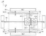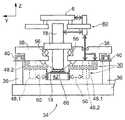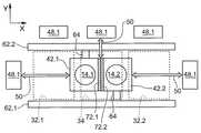 図6は、図1のラインLLで規定される平面図で、別の2ステージ概念を概略的に示す。この概念では、基板42.1、42.2を有するステージは、計量ステーション32と露光ステーション34の間で交換することができる。概念は、水平平面内で第1方向(X方向)に延びる2つのガイド62.1、62.2を与えられる。ガイド62は、ベース・フレーム36に取り付けられることができるが、前記ベース・フレーム36、メトロ・フレーム38、及び投影レンズ18から完全に分離した(したがって、動的結合が無い)機械フレームに、ガイド62を取り付けることが好ましい。各ガイド62は、位置決めシステム(の一部であり、且つ、位置決めシステム)によって制御されるモータによって、ガイド62に沿って第1方向(X方向)に移動することができる要素64を搭載する。この実施例では、要素64は、いわゆる「Tドライブ」の一部であるT要素である。各ステージ42.1、42.2は、1つのT要素64に結合し、T要素64は、結合するステージを、要素64内に存在してもよいモータによってY方向に移動することができる。モータは、位置決めシステム(の好ましくは一部であり、且つ位置決めシステム)によって制御される。好ましい実施例では、ガイド62の、且つ/又は、要素64のモータは、反力の影響を減らすために、バランス・マスと協動する。ステージ42.1、42.2は、動的分離用の空気軸受けを介してベース・フレーム36によって支持されてもよいことが留意される。  FIG. 6 is a plan view defined by line LL in FIG. 1 and schematically shows another two-stage concept. In this concept, the stage with the substrates 42.1, 42.2 can be exchanged between the weighing