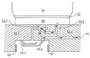 本発明によるリソグラフィ装置の実施例によれば、投影システム18の最終光学(レンズ)要素と、基板14の標的部分の間に液浸液66が存在する(図3)。液浸流体の適用によって、露光中に、液浸流体の無い匹敵するシステムに比べて、パターンのより小さい構造を、レチクル又はマスクから基板14に転写することができるという利点が生まれる。リソグラフィ装置は、投影システムの最終要素と基板の間で液体を閉じ込める液体閉じ込めシステムを有する。液体閉じ込めシステムは、いわゆる液浸フード68(図9を参照されたい)を備える。液浸流体は、液浸フード68によって照射中に所定場所に保たれることができる。液浸フード68は、機械的接触シールを備えてもよく、且つ/又は、その動作が、閉じ込められる流体に向かって圧力ガス流を誘導することに基づく非接触シールを備えてもよい(組合せが可能である)。  According to an embodiment of the lithographic apparatus according to the invention, an